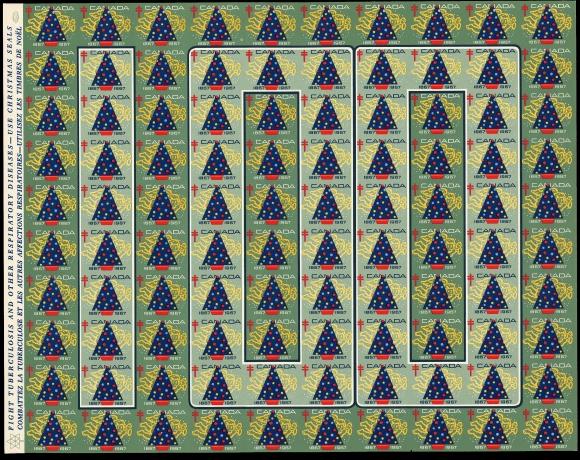 1967 Christmas Seal, a very nice set of eight full progressive proof sheets of 100, printed in red only, gold only, red and gold, blue only, blue and gold, green only, green and gold and finally the completed design, a scarce set from our Centennial year, VF NH (Image)