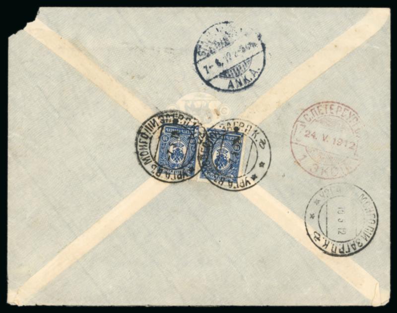 1912 (May 7) envelope sent registered from Urga to Sweden franked on the reverse with two Arms 10k tied by Urga double circle ds (Hellrigl type 6), with St Petersburg transit and Stockholm arrival adjacent, obverse with Cyrillic and Wester language registration labels, minor peripheral imperfections, fine. (Image)