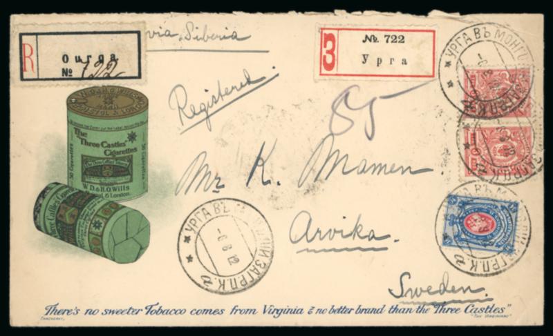 1912 (Aug 6) "Three Castles Cigarettes" printed advertising cover sent registered from Urga to Sweden, franked with Arms 3k pair and 14k paying the correct rate, tied by Urga double circle ds (Hellrigl type 6), with Cyrillic and Western registration labels adjacent, reverse with further despatch, St. Petersburg transit and Stockholm arrival, neat way seal with Chinese chop, a highly attractive cover. (Image)