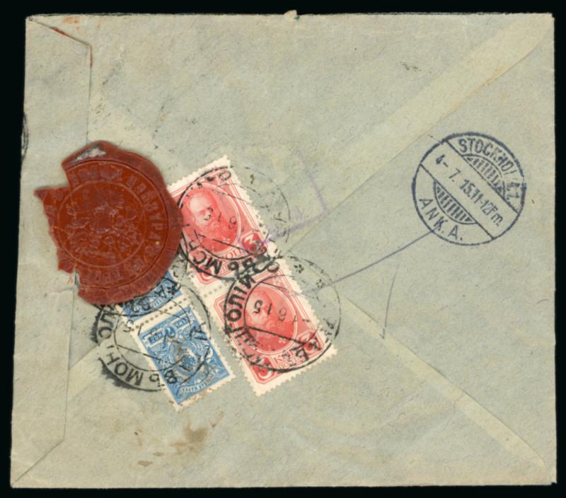 1915 (Jun 1) envelope sent registered from Urga to Sweden, franked on the reverse with 1913 Romanov 3k vert. pair and Arms 7k vert. pair paying the correct rate, tied by Urga double circle ds (Hellrigl type 7a), stamps partially covered by red Imperial wax seal of Petrograd, Stockholm arrival adjacent, some envelope warping, a very scarce usage of the Romanov issue in Mongolia. (Image)
