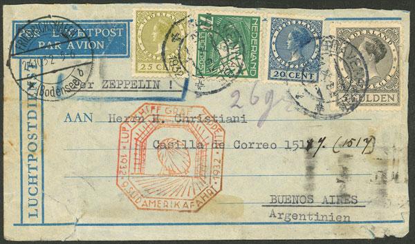 21/OC/1932 Den Haag to Argentina, airmail cover sent by Zeppelin franked with 6.20G., with transit mark of Friedrichshafen and on back Buenos Aires arrival, some small defects, very fine appearance! (Image)