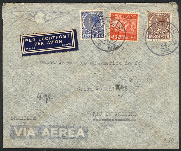 Airmail cover sent from Amsterdam to Rio de Janeiro on 11/DE/1935 by Air France (transit backstamp of Paris), very nice! (Image)