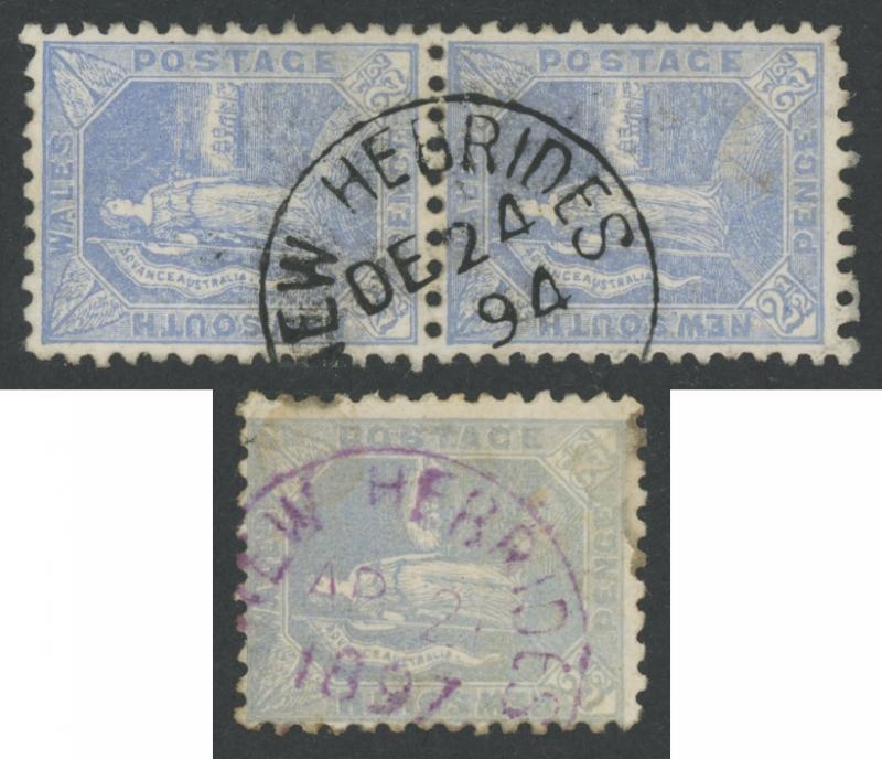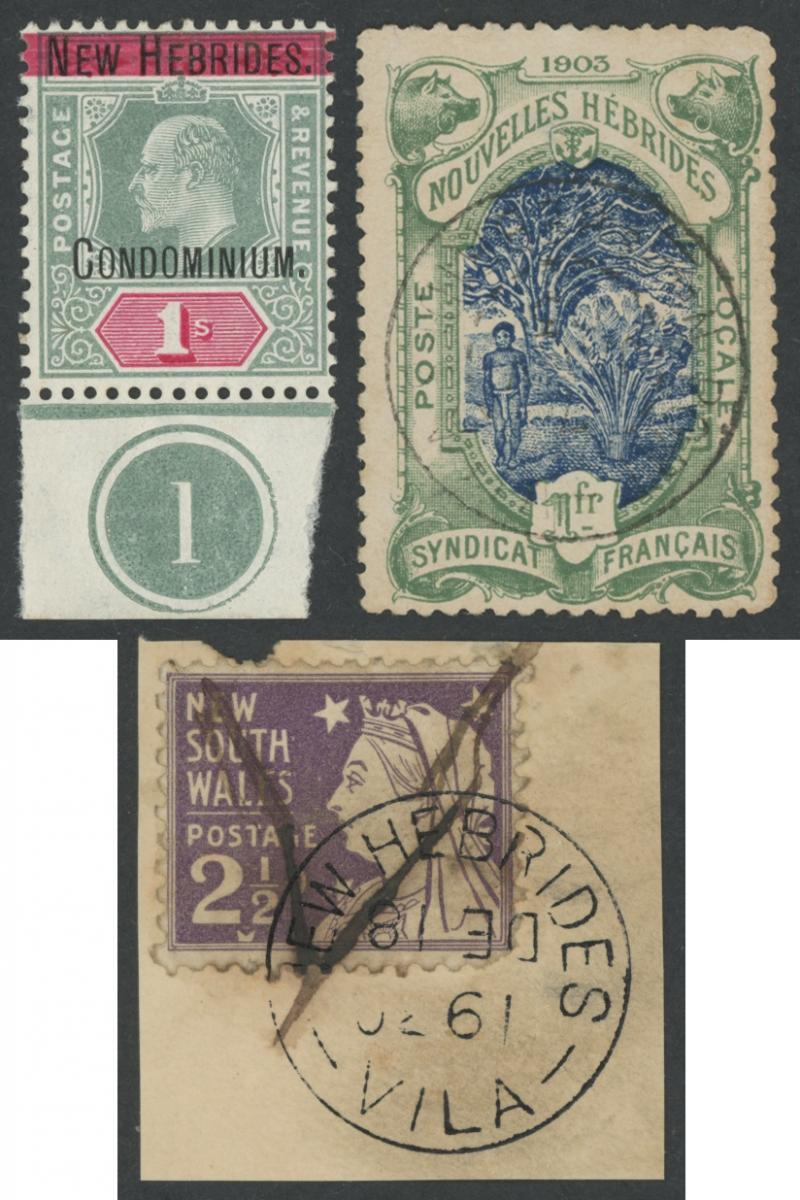 1894-97 usage of New South Wales ½d grey pair on piece or 2½d Allegorical singles x3 or pair all with the 'NEW HEBRIDES/VILA' cds including superb strike of DE24/--94 (century slugs omitted) and light strike of AP21/1897 in violet (not recorded thus by Hals & Collas).