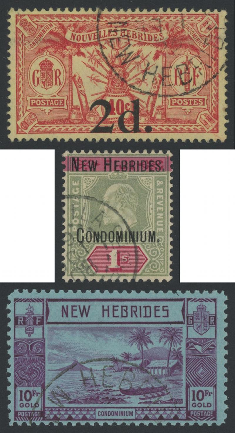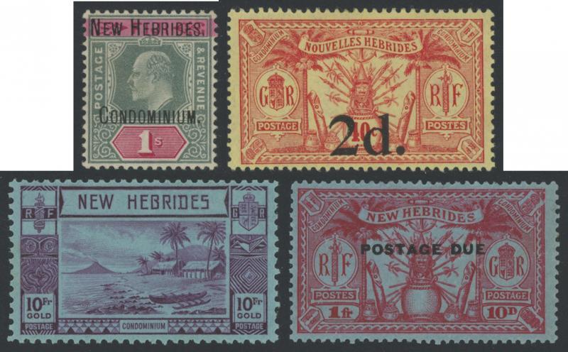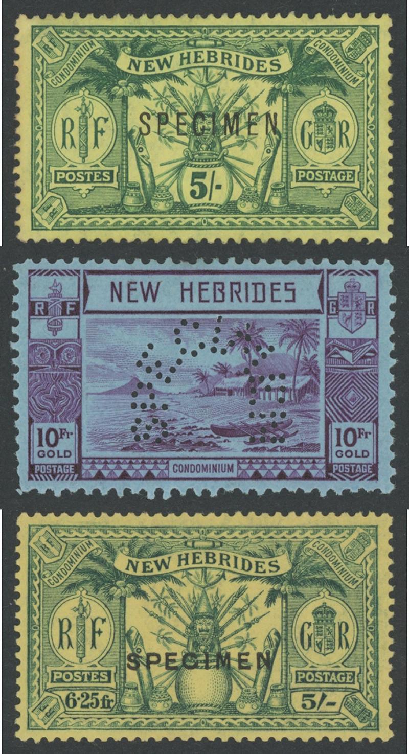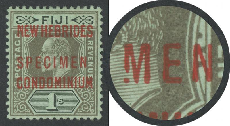 1910 Second 'NEW HEBRIDES/CONDOMINIUM' Overprints on Fiji ½d to 1/- SG 10-16 overprinted 'SPECIMEN' each from [Pos 27] with Break in Left Leg of 'M' of 'SPECIMEN', lightly mounted, Cat £275 plus a large premium for a matched set each with the major variety. An important set for the collector of Specimen stamps or Keyplates.