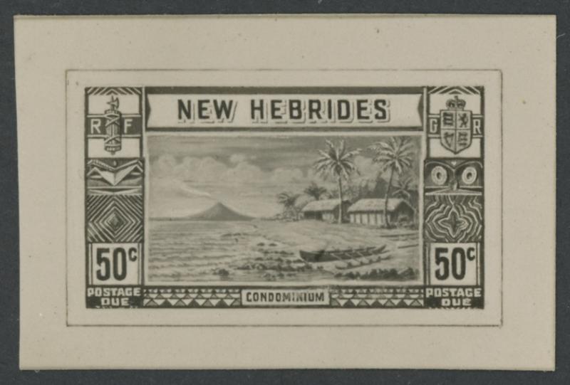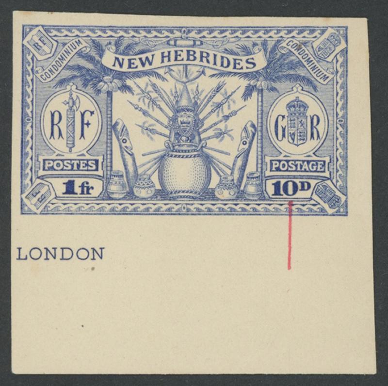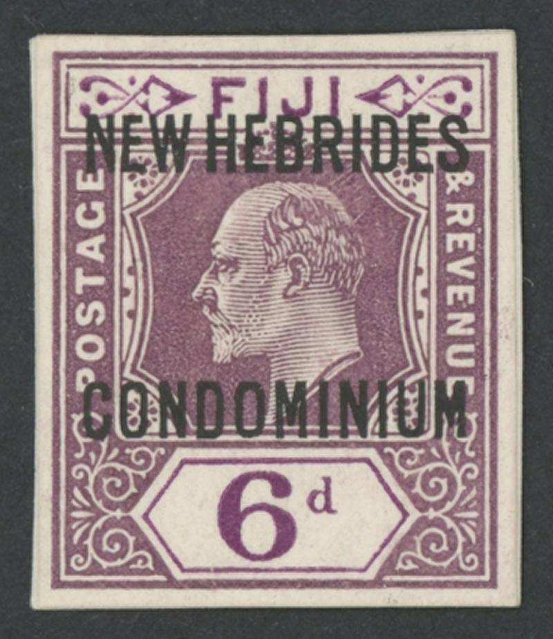 1910 Second 'NEW HEBRIDES/CONDOMINIUM' Overprints on Fiji 6d imperforate plate proof in the issued colours of dull purple & bright purple on thin card, minor surface-rubbing, non-contemporary endorsement "Proof 10.5.1910/appd May 30th" on the reverse. Rare: stated only two examples have been recorded. The overprints were effected in Suva but where did the plate proofs on card originate? (Image1)