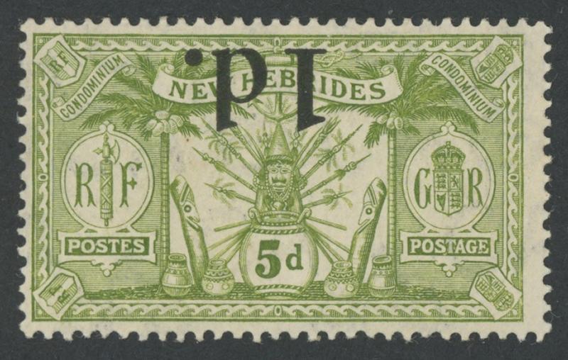 1920-21 Surcharges on 1911 Weapons & Idols '1d.' on 5d sage-green with the Surcharge Inverted SG 30a, characteristic lightly tropicalised gum, three pencilled guarantee handstamps, Cat £4500. Absent from 'Besancon'. The 'Santo' example sold in 2000 for $2350. (Image1)
