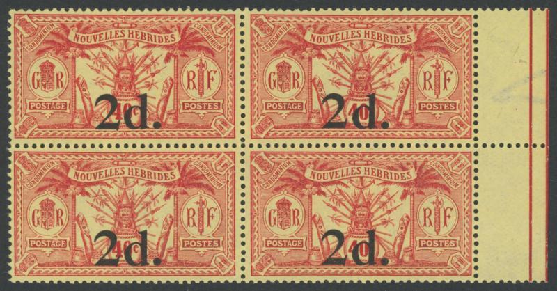 1920-21 Surcharges on 1911 Weapons & Idols '2d.' on French Paper 40c SG 35 marginal block of 4 from the right of the sheet, well centred, unmounted, Cat £520+, for mounted singles. (Image1)