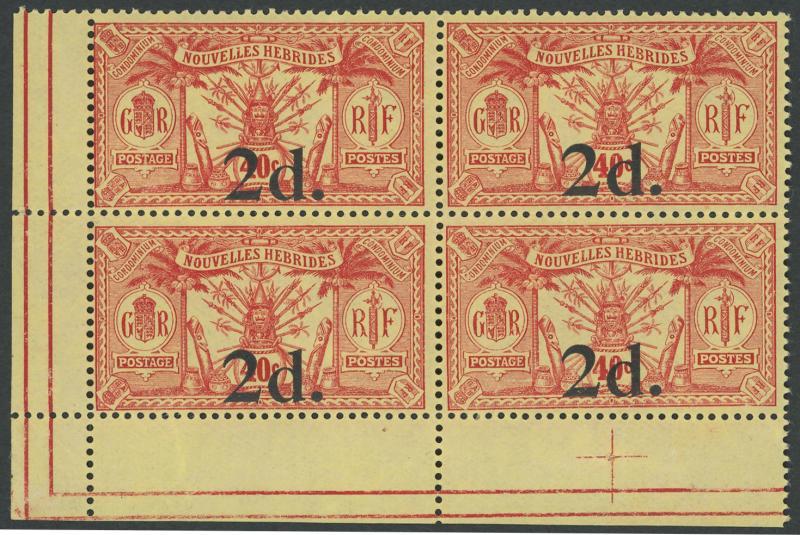 1920-21 Surcharges on 1911 Weapons & Idols '2d.' on French 'RF Watermark 40c red/yellow SG 35 corner block of 4 from the lower-left corner of the sheet, unmounted, Cat £520+, for mounted singles. Superb. (Image1)