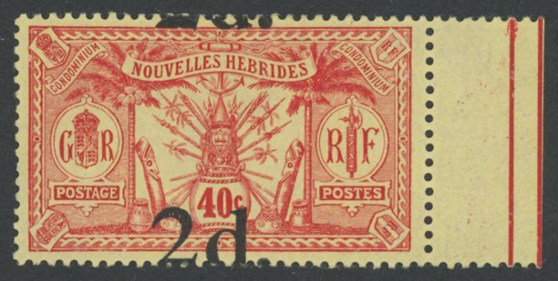 1920-21 Surcharges on 1911 Weapons & Idols '2d.' on French Paper 40c SG 35 with the Surcharge Misplaced 5mm Downwards, very lightly mounted, Cat £130+. (Image1)