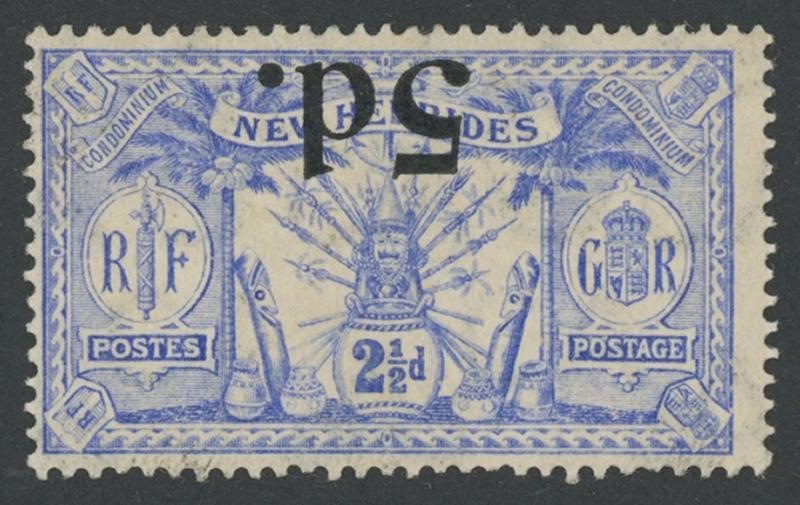 1924 Surcharges on 1911 Weapons & Idols '5d.' on 2½d ultramarine with the Surcharge Inverted SG 42a, characteristic lightly tropicalised gum, two pencilled guarantee handstamps, Cat £3500. Better centred than the 'Besancon' block of 4 that sold for SFr6655. The 'Santo' example sold in 2000 for $2125. (Image1)