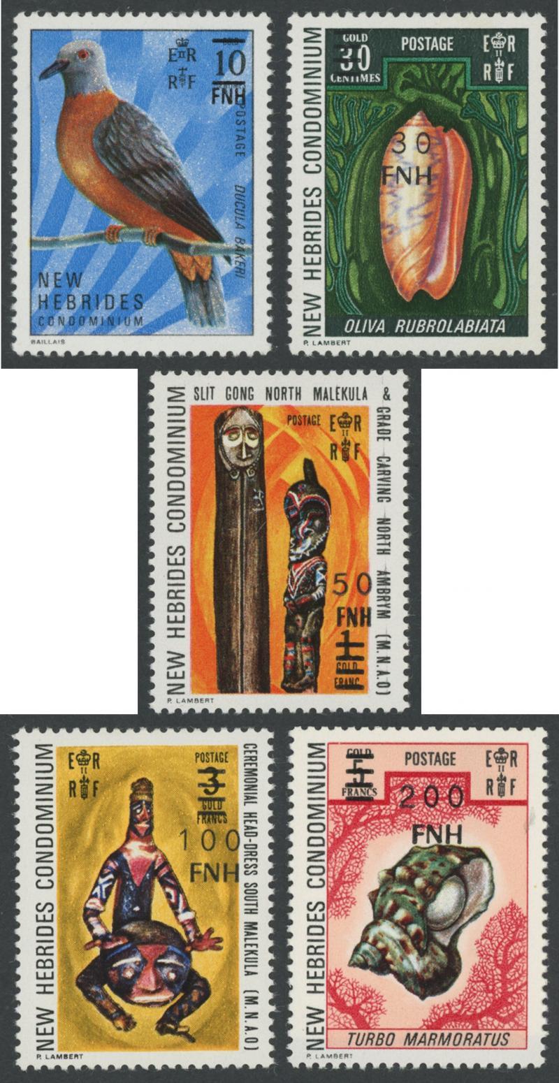 1977 New Currency Provisional Surcharges Paris Overprints 5fr on 5c to 500fr on 10fr SG 220-232 and Vila Overprints 5fr on 5c x2 (one with Heavy Overprint) to 500fr on 10fr SG 233-241 plus Wider Setting 10fr on 10c (unlisted by Gibbons; recorded by Roland Klinger) & 15fr on 15c SG 235a, Type II 35fr on 35c & 200fr on 5fr (unpriced by Gibbons) and the unissued 50fr on 1fr & 100fr on 3fr (mentioned by Gibbons in a footnote), unmounted, Cat £445 plus the unlisted 10fr & unpriced 200fr. Difficult to assemble.