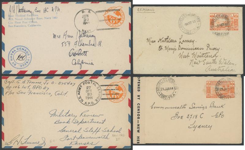 Official mail including 1942 to NSW with 'France Libre' 5c 10c & 15c and 'PORT-VILLA/...' (error) R cachet, 1945 to NSW with the same error R cachet plus scarce local censor label & New Caledonia censor cachet, 1948-49 stampless to NSW x3, 1963 large piece with 1957 30c & 2fr x2, many addressed to Ray Baldwin or John Gibson with a good range of adhesives, also a variety of 'PAID' cds & town handstamps on provisional R labels, many airmail usages, condition variable but most are fine to very fine.