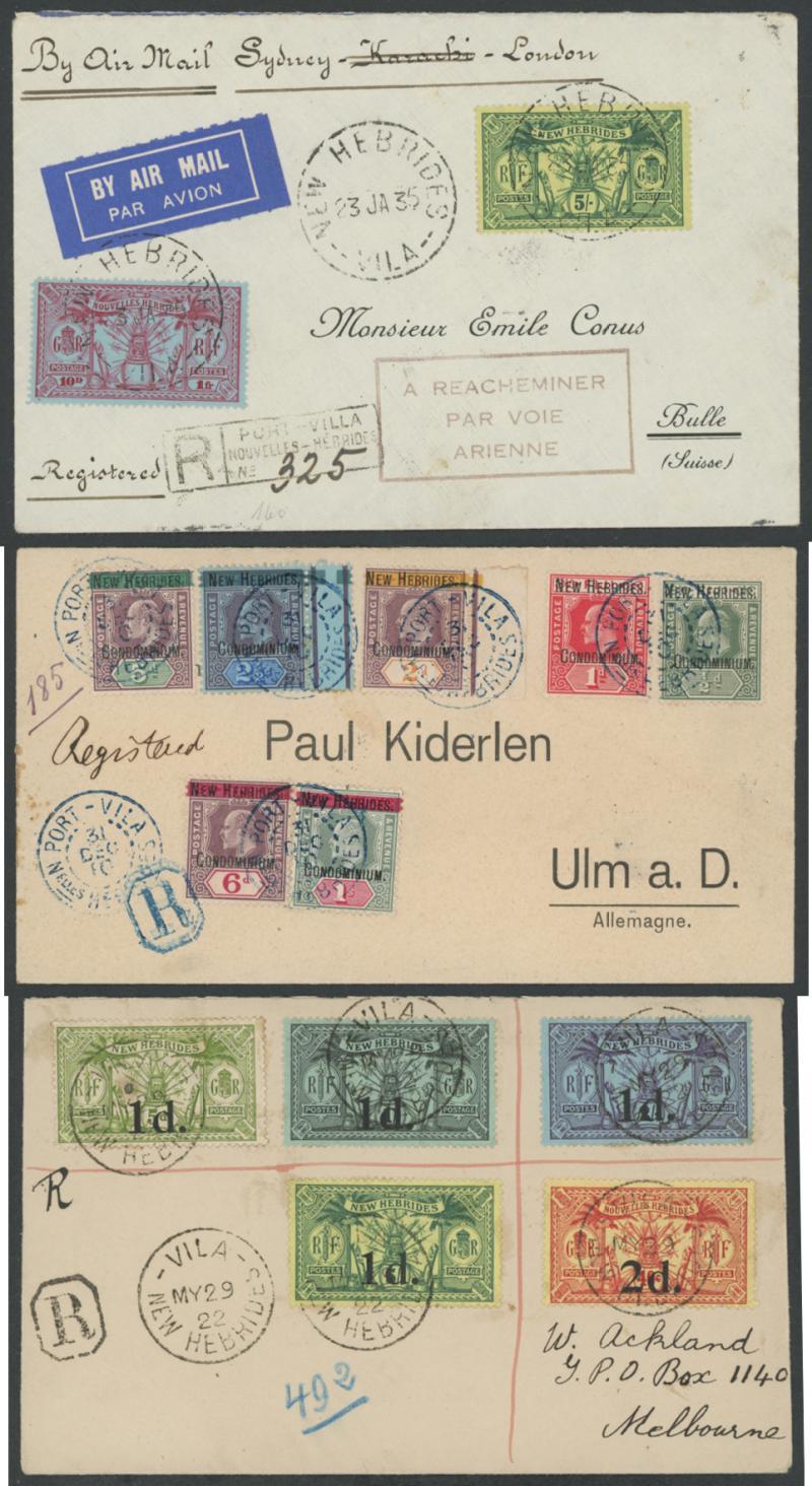 Mostly 1950s-1970s commercial covers with a few mixed issue & commemorative frankings plus British/French combination frankings x12, cds including 'LAMAP', 'LOLOWAI', 'MELSISI', 'NORSUP', 'TANNA' & 'TONGOA', registered x6 including with Australian-pattern R labels of 'LAMAP' & 'SANTO' x2 plus Avis de Reception cards x3, a few with company imprints, many airmails including inter-island services and to Argentina (underpaid & taxed), Cameroun, Canada x2, Fiji, Finland, Guadeloupe (to a ship's passenger with crude 'NON A BORD' label), Holland, Solomons x5, Sweden and Tahiti x2, also to Victoria with boxed 'NOT ELIGIBLE FOR/AERIAL MAIL. FEE/DEFICIENT/Vila No 1 (NH)' cachet (not recorded by Ted Proud) and to USA underpaid & taxed, Aerogrammes x7 unused/CTO, a few inwards items, generally fine to very fine. A very good lot.