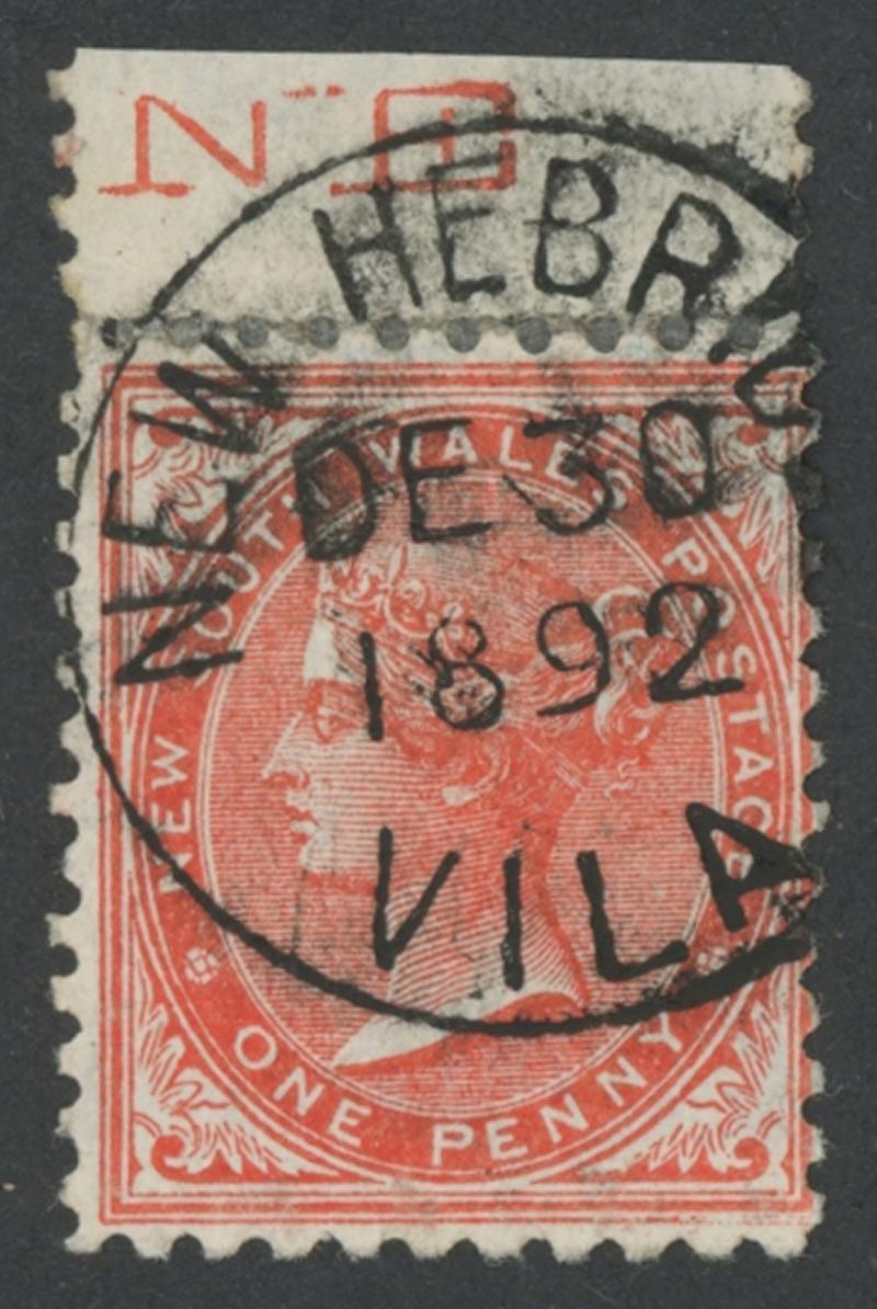 1892 usage of New South Wales ½d orange-red with superb strike of the 'NEW HEBRID[ES]/ DE30/1892/VILA' cds. The earliest recorded date: see Hals & Collas at page 144. John Gibson states the cds was supplied from Sydney in August 1892. (Image1)