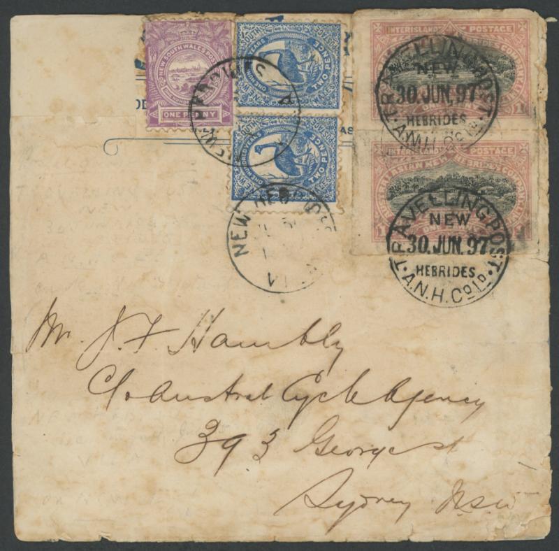 1897 large-part Hambly cover (reduced at left) to Sydney with combination franking of Australasian New Hebrides Company rouletted 1d pair tied by two very fine to superb strikes of the 'TRAVELLING POST/NEW/30JUN97/HEBRIDES/ANH CO LD' cds plus NSW Centenary 1d & 2d Emu pair tied by 'NEW HEBRIDES/VILA' cds (indistinct date), Sydney arrival backstamp of JY14/97, significant faults but an apparently commercial double-rate usage. (Image1)