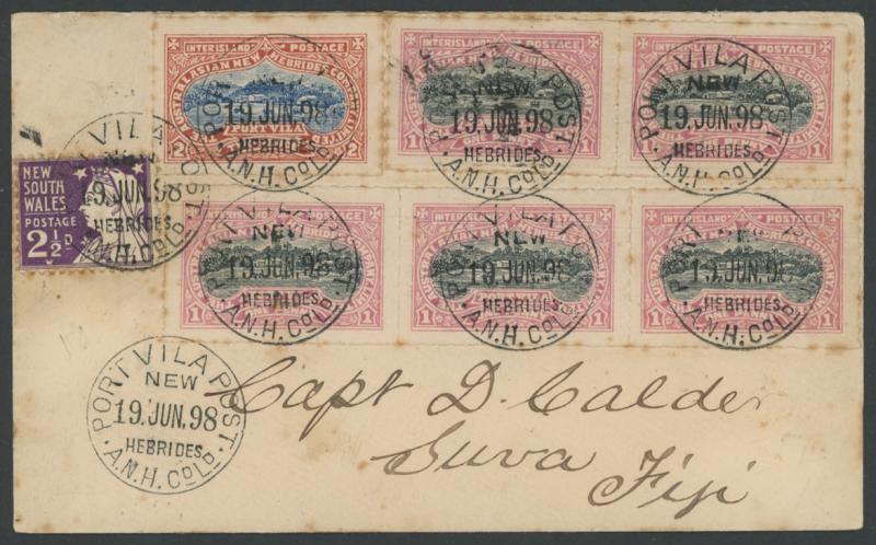 1897 philatelic cover to Fiji with combination franking of Australasian New Hebrides Company rouletted 1d pair & strip of 3 + 2d tied by multiple fine to very fine strikes of the 'PORT VILA POST/NEW/19JUN98/ HEBRIDES/ANH CO LD' cds, another strike tying New South Wales Jubilee 2½d violet, minor toning. The lack of any transit or arrival markings suggests the cover was not put in the mails. (Image1)