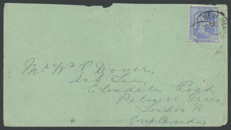 1898 social cover to England with New South Wales Allegorical 2½d tied by large-part 'NEW HEBRID[ES]/ JY7/1898/VI[LA]' cds (month slug before day slug), the reverse with superb 'SYDNEY/AU1/98/ 14 ' transit & London arrival of SP5/98, light vertical fold & minor opening fault. Very few usages on pre-1901 covers have been recorded. [The addressee, William R Dover, was an early missionary in the islands] (Image1)