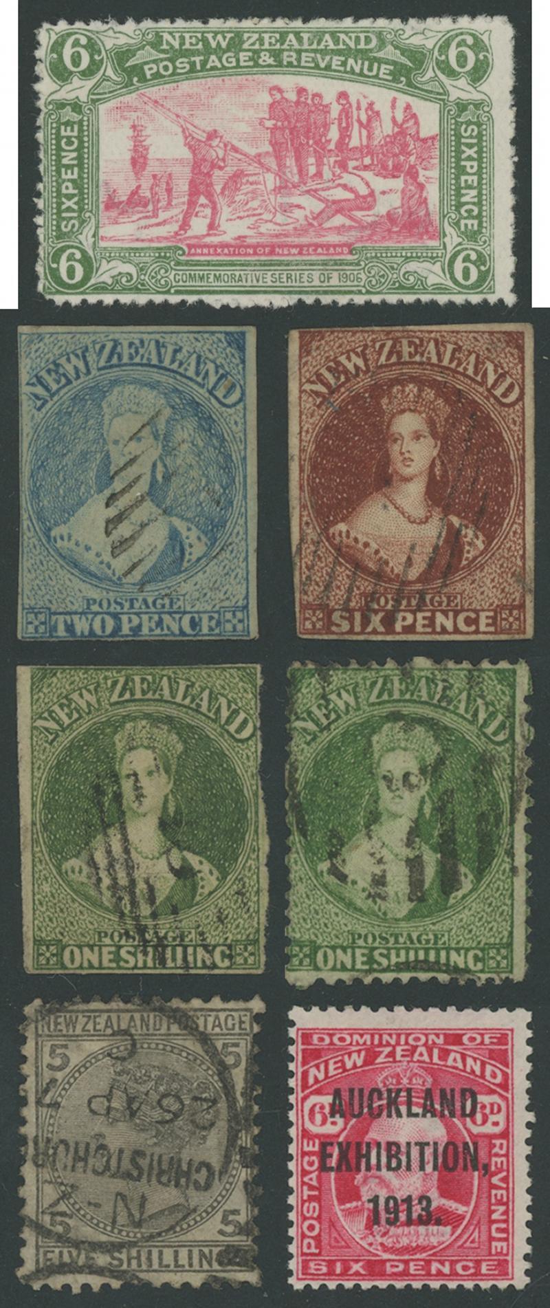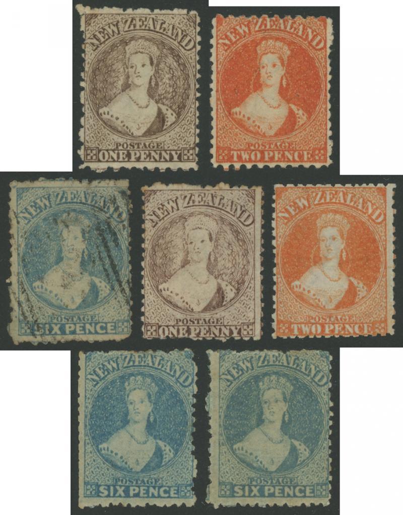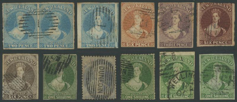 1857-74 Chalons selection in small stockbook, all identified as per Gibbons and stated to include 1857-63 No Wmk Imperf 1d, 2d x23 (including a pair & huge single) & 6d x11 including a real chestnut (margins just clear to close), 1862-64 Wmk Star Imperf 1d x4, 2d x20 (including two pairs) & 6d x33 and Rouletted 7 6d SG 55 & 1/- SG 56, 1862-64 Dunedin Printings Perf 13 3d & 6d x5, Pelure Paper Imperf 1d (small tear) 6d x3 & 1/- x3 and Perf 13 2d & 6d x2, 1863 No Wmk Perf 13 2d, Wmk 'NZ' Imperf 1d x2 2d x2 6d x4 & 1/- x4, 1864-71 Wmk Star Perf 12½ 3d lilac x9 & deep mauve x4, 4d yellow x11, 6d strip of 3 & 1/- x9, 1871-73 Perf 10 1d, etc, condition variable but generally good to fine and many are very fine with a high percentage of the imperfs having full margins, Cat £42,000+. An excellent lot for research, to enhance or develop a collection, or for resale. The conservative estimate equates to only $33 per stamp.
