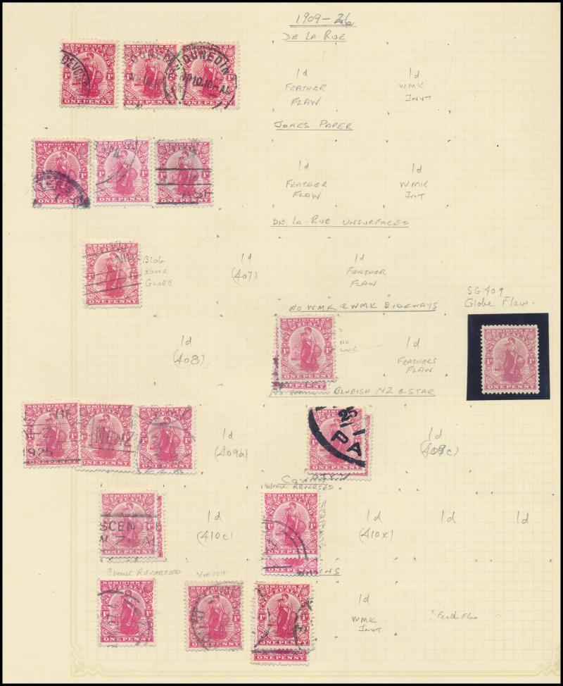 Collection on leaves the earlies predominantly used with just a few Chalons then First Sidefaces Blued Paper 1/- green used, Second Sidefaces range by papers & perfs, 1898-1907 Pictorials to 2/-, 1909-13 KEVII set plus extras, 1d Universals & Dominions page noted Globe Flaw *, KGV Heads with perfs, papers & shades plus a few multiples, early Airmails & Health issues (ex Smiling Boys), 1935 Pictorials range noted 2/- 'COQK' *, then increasingly both mint & used to 1960 including 1953 QEII set to 10/-, also 'OFFICIAL' overprints with KEVII set used, 2/- Admiral, 5/- Arms, etc, Postage Dues from 1899 Type I ½d * then a range by papers & perfs and similar for Life Insurance, condition a little variable but most are fine to very fine.