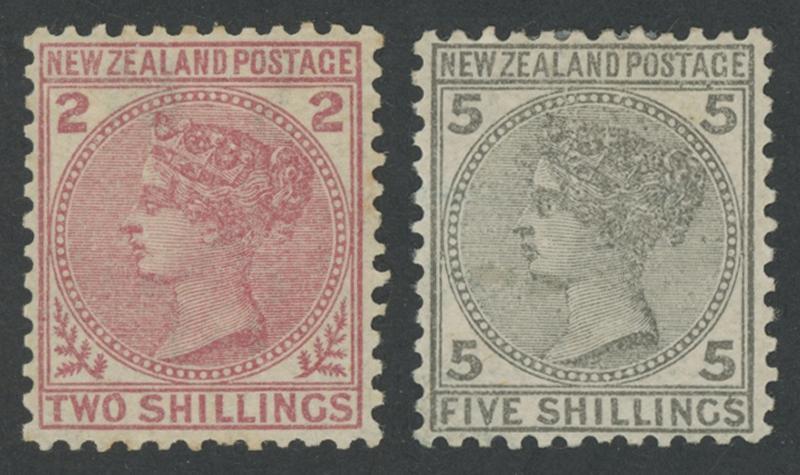 1874-78 QV First Sidefaces 2/- rose SG 185 (CP C7a), well-centred, minor gum aging, very lightly mounted, and 5/- grey SG 186 (CP C8a), very fresh, small hinge remainder, Cat £1200 (CP NZ$2425). (2) (Image1)