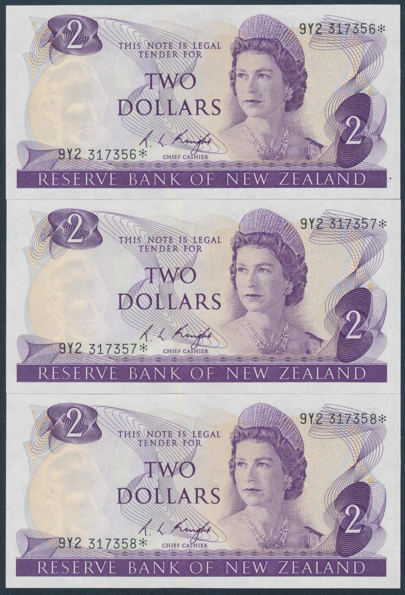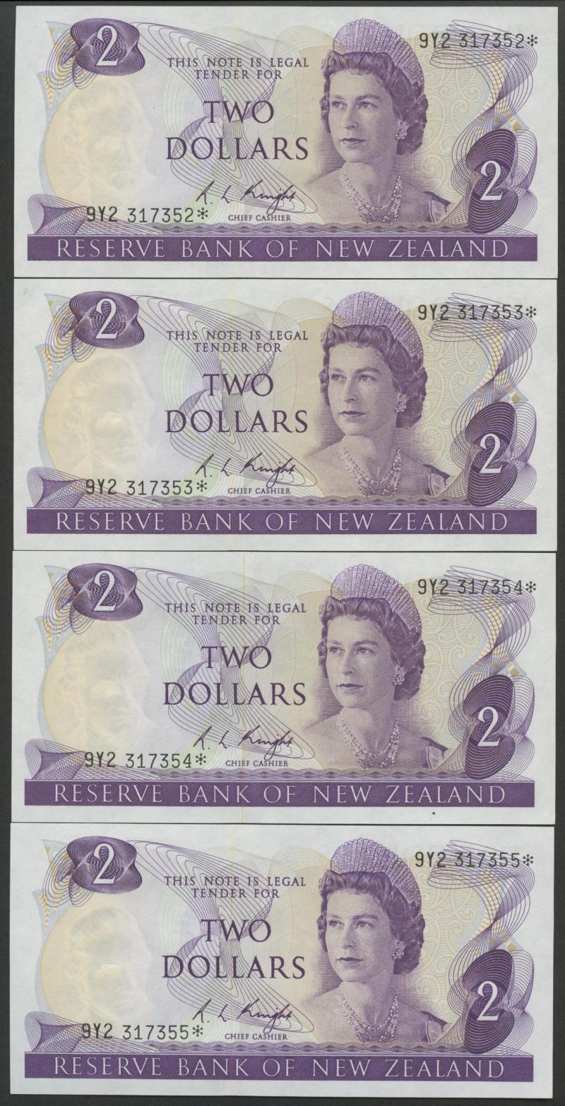 1975-81 $2 Star Replacement group comprising 1975-77 Knight P164c run of four serials '9Y2 317352 *'-'355 *'; and 1977-81 Hardie Type I P164d run of four serials '9Y3 176835 *'-'838 *'; all Uncirculated, Cat NZ$420.
