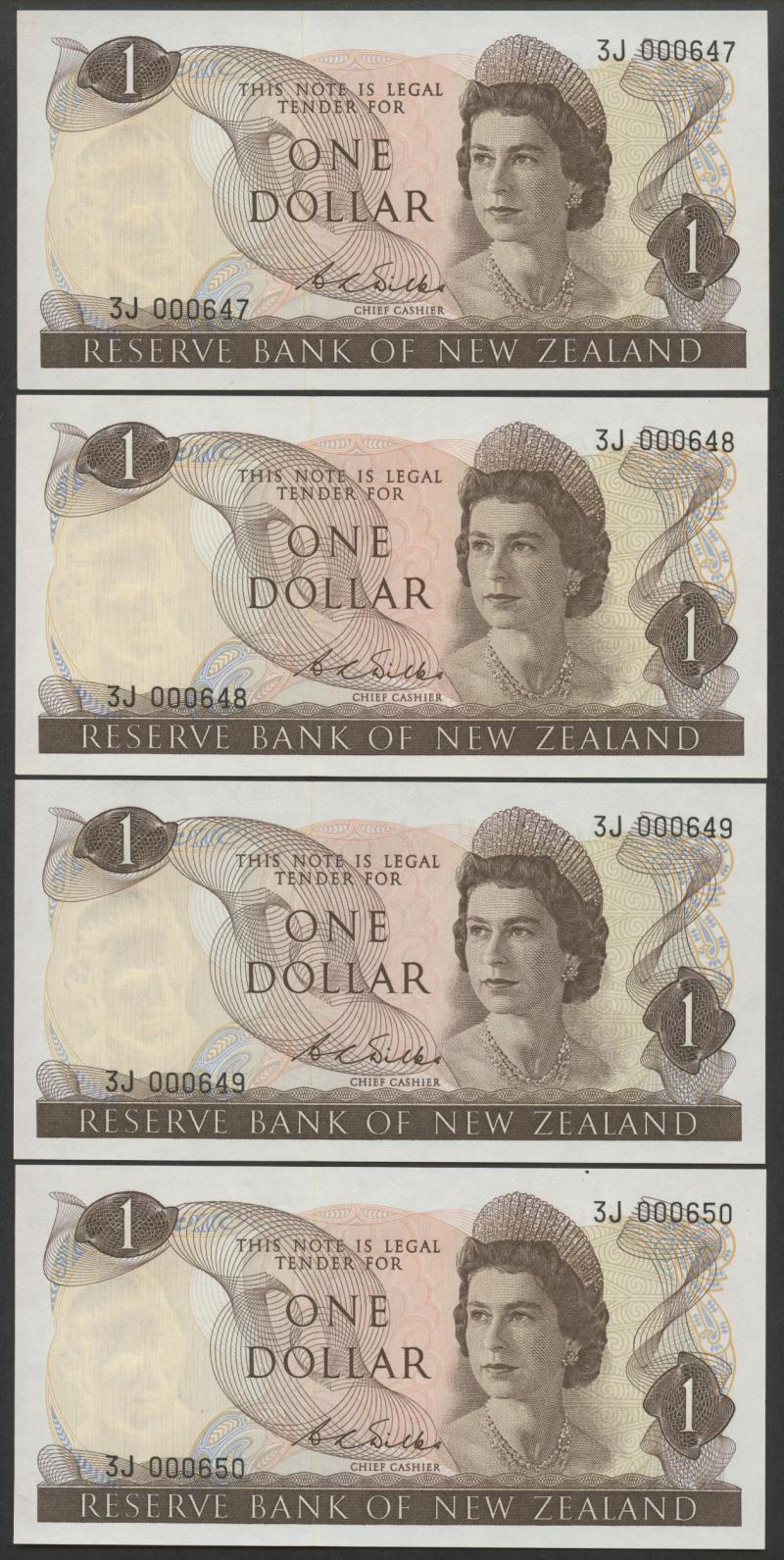 1968 $1 Wilks P163b Low Numbered First Prefix consecutive run of four serials '3J 000647'-'650', Uncirculated, Cat NZ$380.