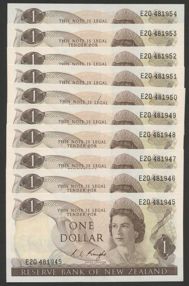 1975 $1 Knight P163c consecutive run of ten serials 'E20 481945'-'954', Uncirculated, Cat NZ$350.