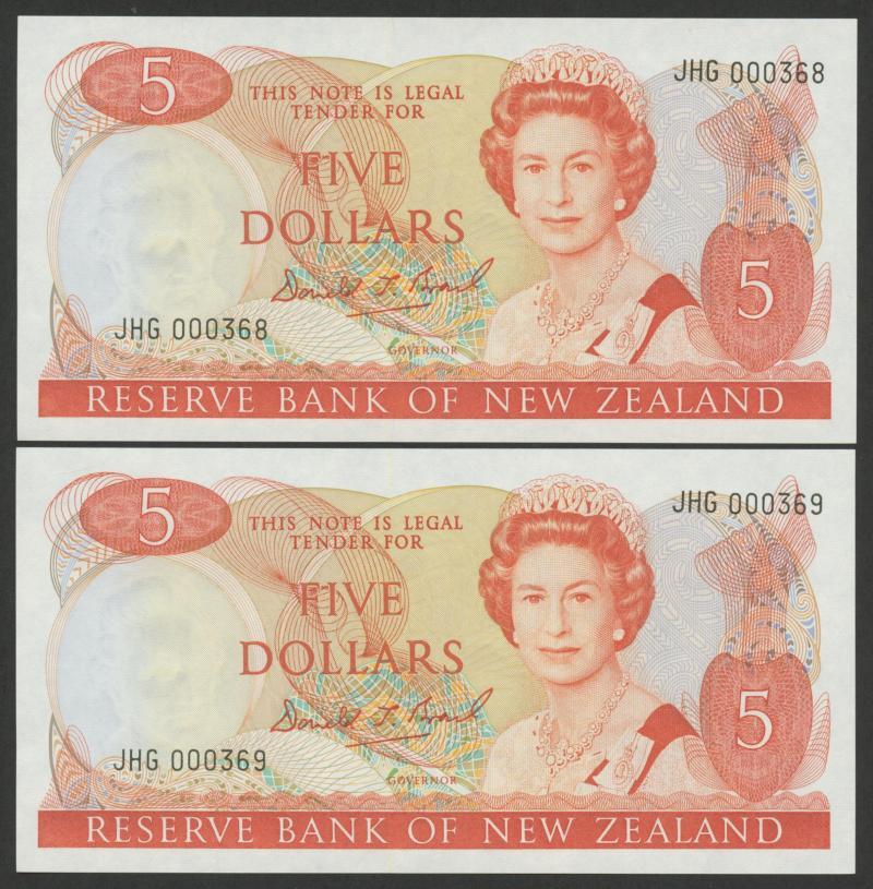FIVE DOLLARS: 1967-77 $5 QEII Type I Portrait group comprising 1967 Flemming P165a consecutive run of five serials '003 399024'-'028', 1968 Wilks P165b Last Prefix '079 016252' (VF), 1975 Knight P165c consecutive run of three, and 1977 Hardie P165d Star Replacement consecutive pair Prefix '991', all with light pay-packet bends, condition variable, Cat (Bertrand) NZ$1200+.