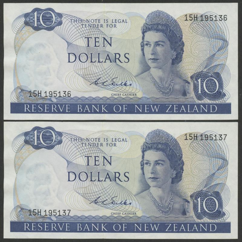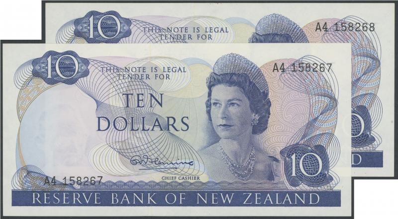 1968-75 $10 Wilks P166b run of four serials '15H 195136'-'139', light centre-fold on two units, light bend on two units, aUnc, Cat NZ$700.