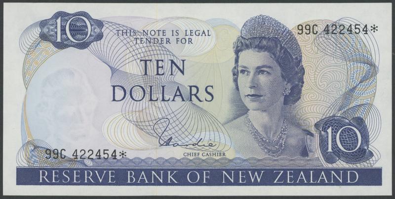 1977-81 $10 Hardie Type I Star Replacement P166d serial '99C 422454 *', Uncirculated, Cat NZ$175. (Image1)