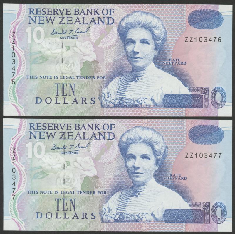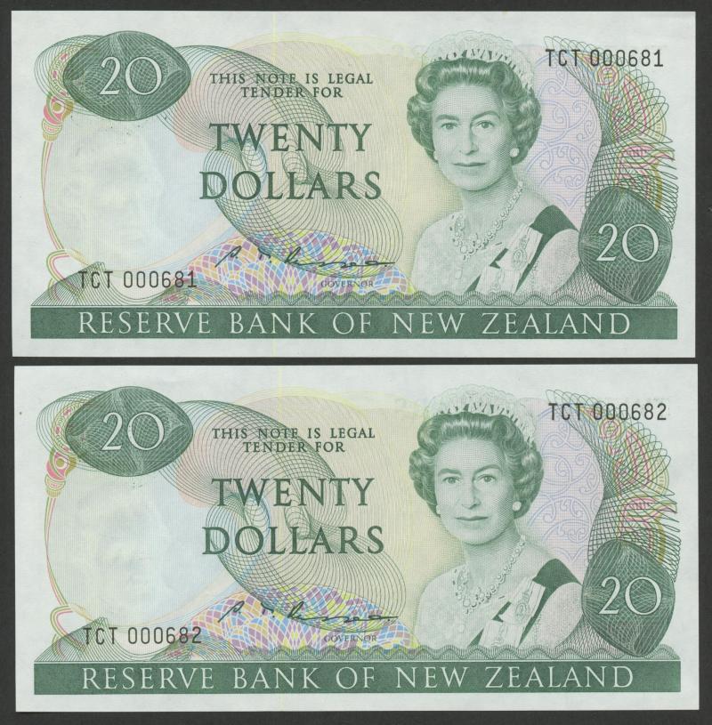 1985-89 $20 Russell P173b Low Numbered First Prefix pair serials 'TCT 000681'-'682', Uncirculated, Cat NZ$240. (Image1)