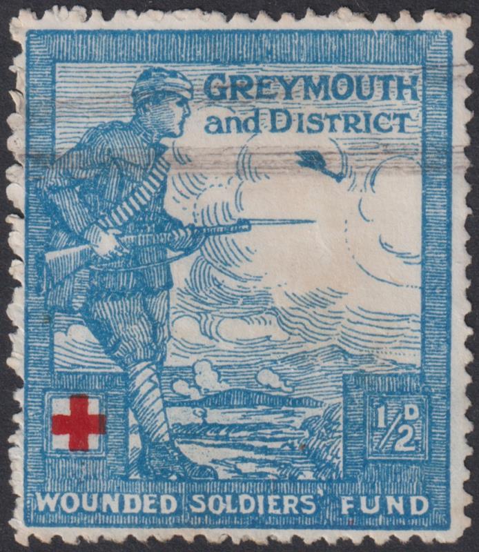 1915 ½d Greymouth Wounded Soldiers Fund, horiz postal type cancel line. Minor blemishes but well above average cond. Heslop J23. Cat $200. (Image)