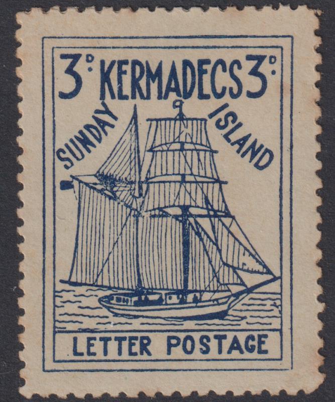 1937 3d Kermadecs (Sunday Isl) blue "LETTER POST" stamp depicting ship. Very minor faults. ACS cat $350. Mint. (Image)
