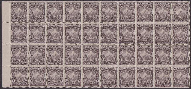 1898 ½d Mt Cook sepia horiz block of 40 (10 x 4) with lower L/H selvedge. A remarkable block. Jury cat $1200. MUH. (Image)