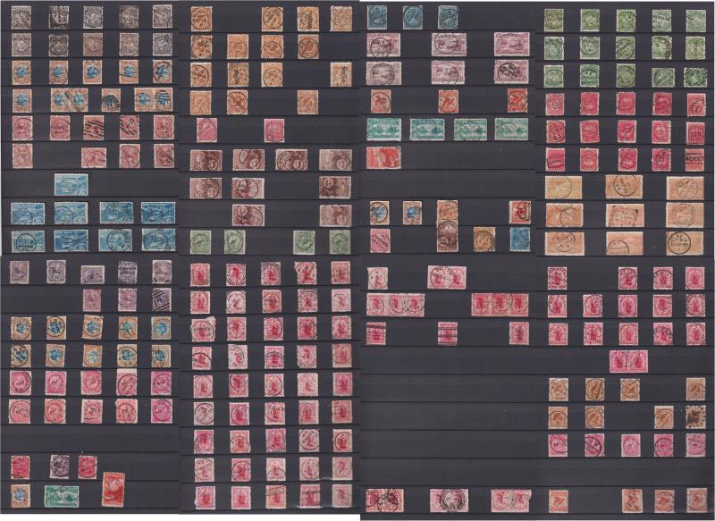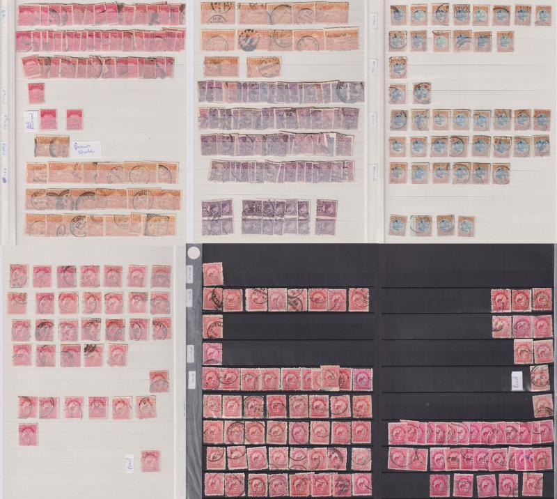1898-1907 seln of 240+ v on 4 s/b pages, superb used, majority with very fine cds cancels & incl various RTPOs. Noted: 6d green x 4; 2/- x 4 FU + 1 fiscal; 5/- x 2 fiscals; 6d red – imperf at top. Cat $2040+. (Image)