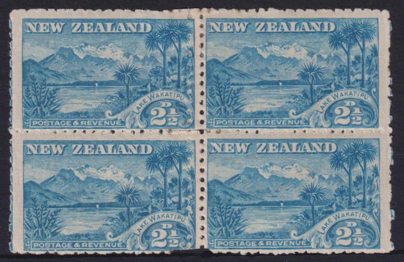 1899 2½d Wakatipu block of 4, p11, no wmk, reperfed down centre with official patch, lower pair unhinged. CP E8b/z. Cat approx $900. Mint/MUH. (Image)