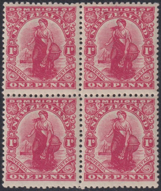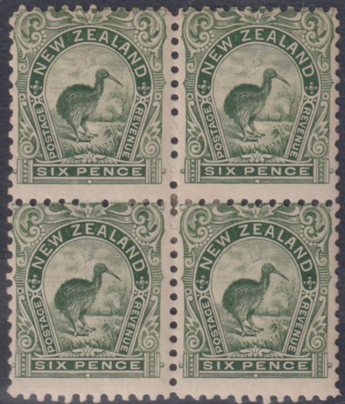 1899 6d Kiwi green block of 4, p11. CP E14b. Cat $800. Mint. (Image)