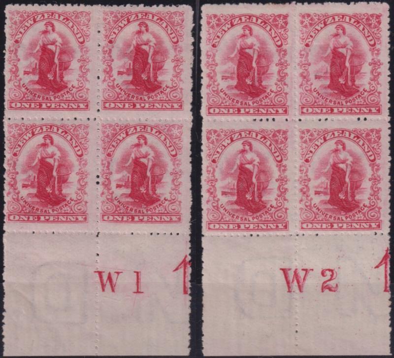 1906 Waterlow plates - "W1" & "W2" plate blocks of 4, p14. CP G9a var. Cat $2500. LH mint. (Image)