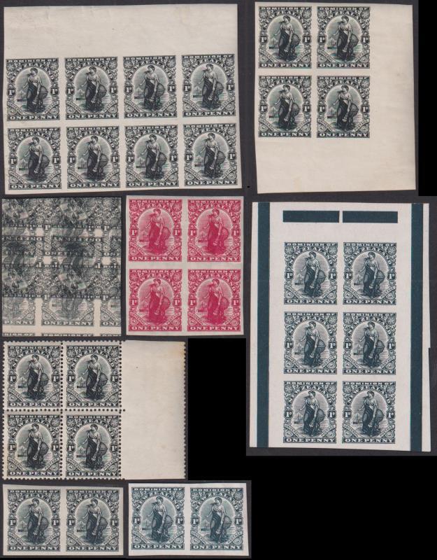 c1909 plate proof seln in black: vert block of 8, lower corner b of 4; 2 horiz pairs all imperf & booklet pane of 6; perf 14 x 15 b of 4 with R/H selvedge; in red imperf b of 4 (DLR unsurfaced paper). Also imperf b of 4 in black multiple printings on back. This latter item probably printer's waste. CP cat approx $850. (Image)