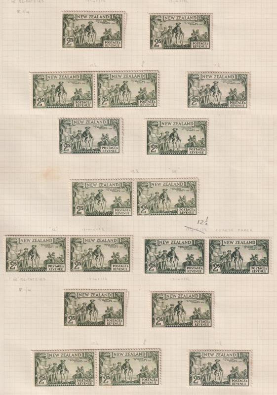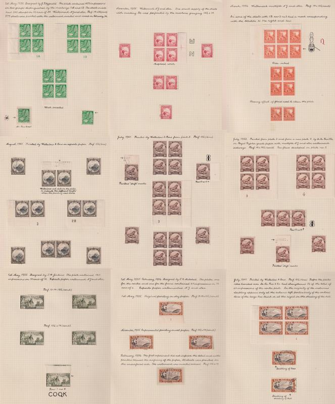 1935-42 extensive mostly mint/MUH specialised colln, superbly written up c1950 by RJG Collins (designer of the 1d, noted philatelic authority & lifelong friend of the former owner Fred Musgrove of Christchurch). On interleaved linen-hinged pages in fine F Godden looseleaf album. Logically laid out by denomination ½d to 3/- & issue date of each sub-type. Many diff shades, plate blocks (some selvedge plate singles), plate flaws in blocks or singles (illustrated by fine ink drawings), invtd wmks, perf & paper varieties, booklet panes etc. Most mint blocks of 4 incl 2 MUH stamps. Many scarce or rare items (no doubt directly from Collins' stock). The 1935-36 1st wmk issues incl ½d clematis flaw FU, 1d p13½ x 14 CP L2b selvedge block of 4 with 2 stamps part 'ZE' letters wmk; 3d L6a block of 9 incl 7 MUH; 5d L8a, L8b mint/MUH blocks of 4; 9d L11a block of 9 MUH. With the 1st issues are a set of 16 superb (enlarged) real photo repros of original artists' drawings to 3/- (incl the 1d by Collins & unused 1/-, 1/3d designs). Multiple wmk issues incl 2d L4b block with R2/3 "tekoteko" flaw; 4d L7c (p14) plate 3 block of 4, cat $2500 (left selvedge mint, stamps MUH); 4d L7d selvedge pair with "shift" markings: 5d plate 2 blocks of 4 mint/MUH; 9d L11c block of 4 MUH & single invtd wmk mint; 9d L11d block of 4 incl 3 MUH; 3/- L14e plate 1 block of 4 mint/MUH. A great opportunity. Fine condition. Cat $27,000+ (many minor items not counted). (Image)