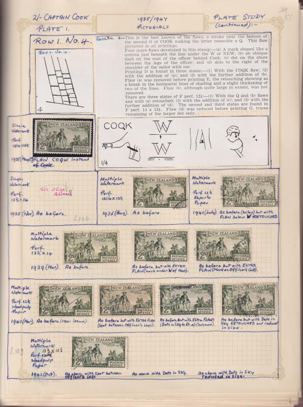 c1935-42 2/- Cook used stamps plating study, based on RJG Collins book, on illustrated/annotated pages with one page covering each of the 120 positions on Plate 1 sheet & 5 pages covering plates 2 & 3. Comprises 750 stamps incl 58 diff CP listed flaws, re-entries & retouches incl R1/4 COQK flaw (incl CP L13a-L13g except no L23b), & R8/2 coconut flaw & re-entries x 7. (Image)