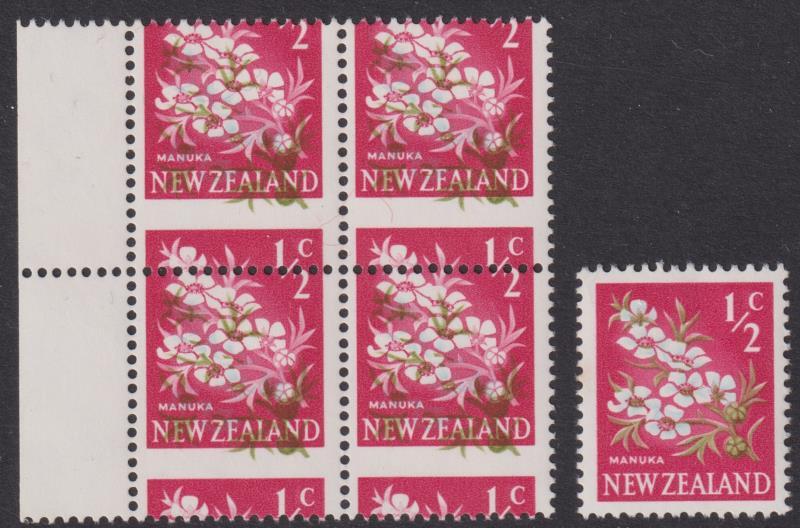 1967 ½c Manuka block of 4 with left selvedge, wine colour shifted 5mm upwards. Spectacular. Not listed by CP. MUH. (Image)