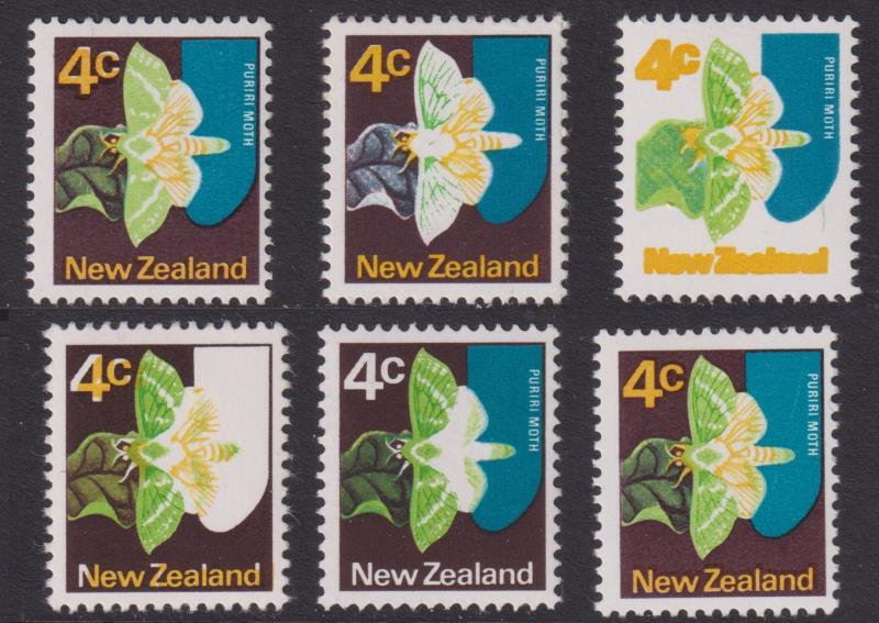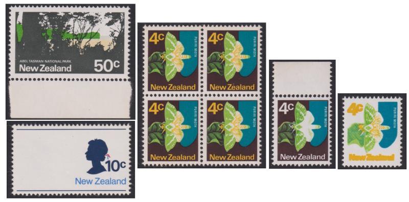1973 seln of colour missing flaws: 4c Puriri Moth yellow omitted CP 6c(V), purple-brown omitted CP 6c(X) & dark green (wing veins) omitted CP 6c(Z) block of 4; 10c Royal stamp with silver (Coat of Arms) omitted CP 12b(W); 50c Abel Tasman National Park yellow-green (headland on right) omitted CP 19a(Z)(2). CP cat $1540. All MUH. (Image)
