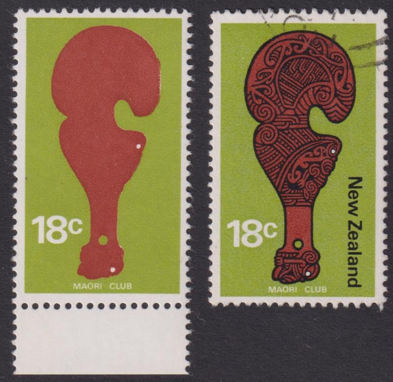 1974 18c Maori Club black colour omitted (no "New Zealand" or carving). Spectacular. With normal for comparison. CP P14b(X). Cat $1200. MUH. (Image)