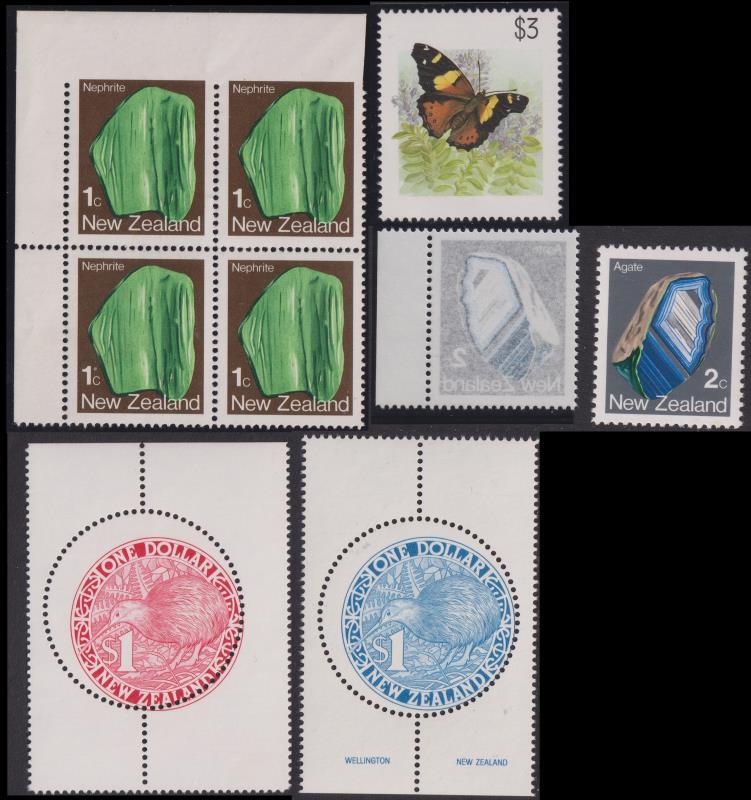 1975 1c Mineral upper left sheet corner block of 4 – imperf at top; 2c Mineral black & blue colours offset; 1991 $1.00 Round Kiwi (red & also blue) singles, grossly misperfed (neither cat by CP), & $3 Butterfly with grey & green colours omitted, on 4 stock cards. CP cat $2650 (plus non cat items). All MUH. (Image)