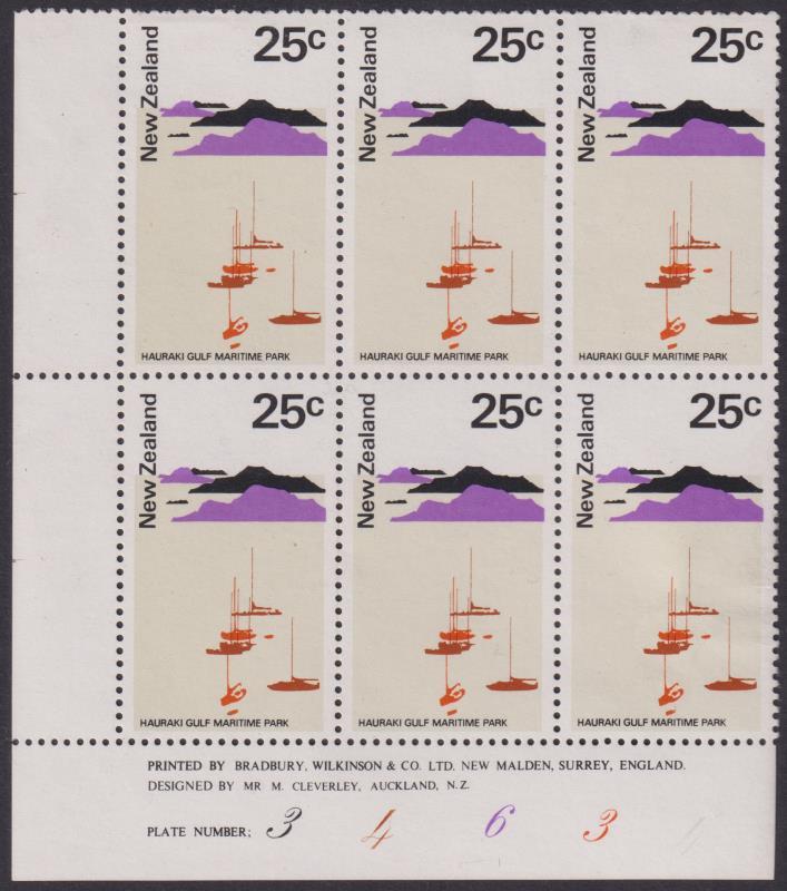 1976 25c Hauraki Gulf National Park plate block 34634, all stamps with mauve colour offset on back. CP P17b(z). Cat $1500. MUH. (Image)