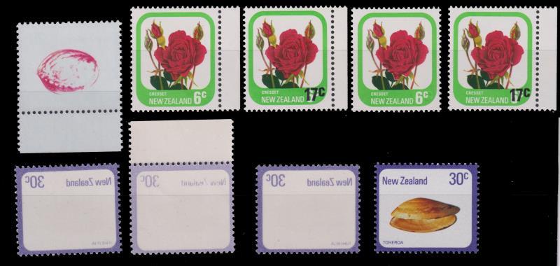 1978-9 errors: 20c Shell magenta colour offset; 30c Shell purple colour offset x 3, with normal for comparison; 17c on 6c Rose (x 2) albino surcharge, with normals for comparison (9v). CP cat $2625. All MUH. (Image)
