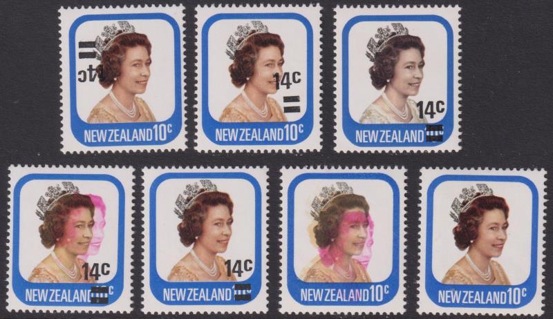 1979 errors: 10c QEII p14 x 14½ magenta & orange colours shifts; 14c on 10c QEII orange colour omitted, magenta colour shifted to right, misplaced surcharge, & invtd surcharge, with normals for comparison (7v). Cat $1825. All MUH. (Image)