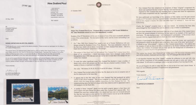 2003 50c Ailsa Mountains error: solid silver ("Concorde") silver fern, & normal for comparison. Together with explanatory NZ Post letter. Cat $1500+. MUH. (Image)