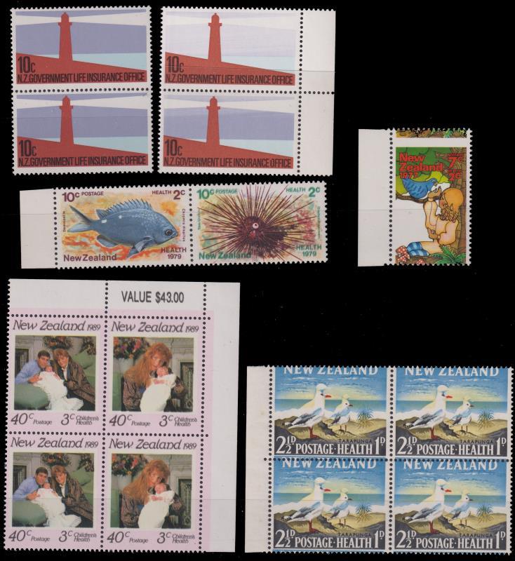 1964-89 errors colln (5v): 1964 2½d Seagull left selvedge block of 4 with major blue colour shifted upwards resulting in misshapen heads & white “surf”, MUH – not listed by CP; 1977 7c Child left selvedge single with vert perf shift, MUH (cat $200); 1979 10c Sea Urchin, double green colour, MUH (cat $250); 1989 40c Royal Family value block of four with double print of black, MUH – not listed by CP. Also, 1981 10c Life Insurance right selvedge vert pair with purple (sky) dry print, MUH (cat $1000). (Image)